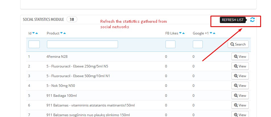 A modul egy speciális widgetet ad az irányítópulthoz, amely megmutatja a Facebook kedveléseket és a G+ kedveléseket minden terméknél a katalógusban. A modul PrestaShop >1.6.0-val működik.